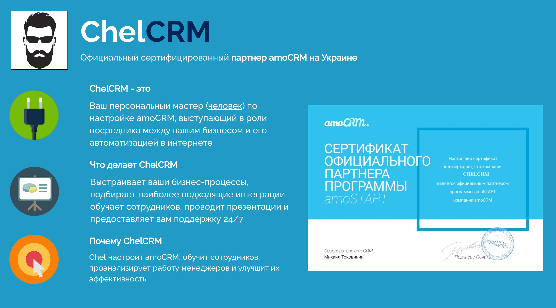 Неделю назад как подключили, все работает очень благодарны chelcrm, хотя сразу немного удивились от названия компании, но вот чем-то зацепило, хорошая поддержка и профессиональный подход
