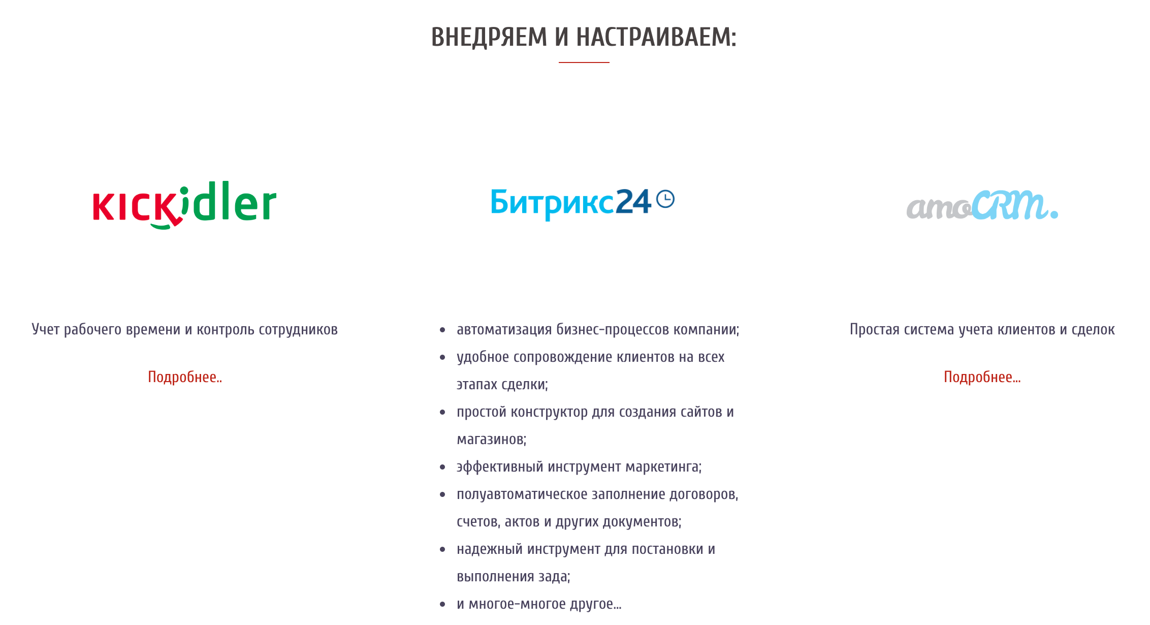 Работаем с Битрикс24 и AmoCRM, являемся их партнерами и осуществляем полную настройку и сопровождение данных систем. На все выполненные работы даем гарантию и осуществляем техническое сопровождение.