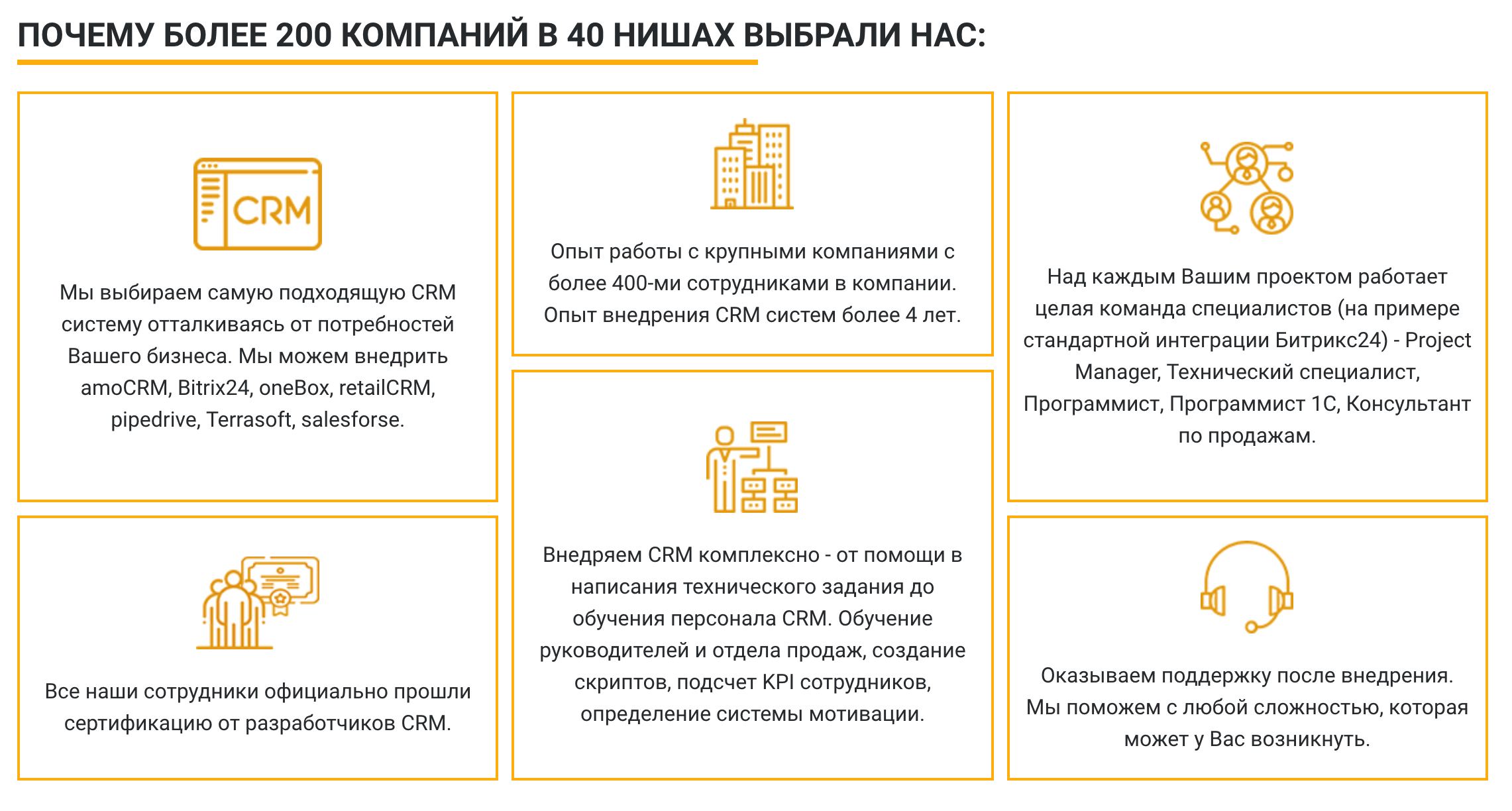 Мы уже более 4 лет занимаемся выбором и внедрением CRM систем. У нас есть опыт внедрения в различных сферах бизнеса: от интернет-магазинов до крупных производств (от 40 сотрудников в отделе продаж по СНГ). Владелец компании Александр Стыгарь, с опытом в продажах и маркетинге более 5 лет, вложил все свои знания для качественного внедрения CRM системы. Построение воронки продаж, чат-боты в месседжерах, создание скриптов продаж, триггерные рассылки и ремаркетинг с CRM, сквозная аналитика - это то, что мы дополнительно вносим в каждый проект при внедрении CRM системы.