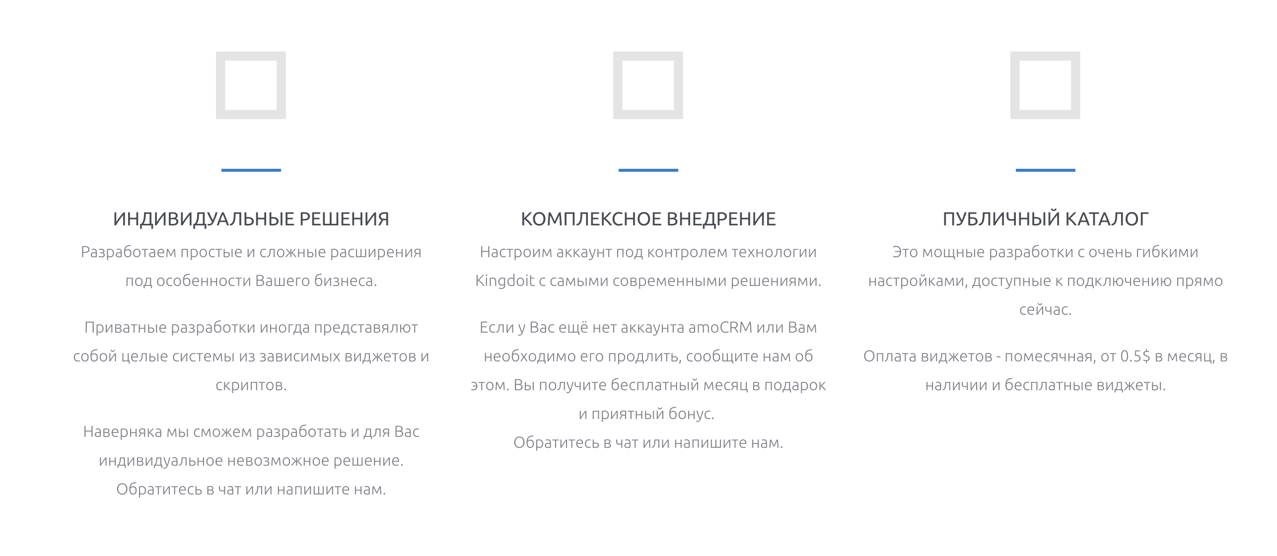 Привет всем! Попросили отзваться. Писать особо нечего, потому что работаем, всё в порядке, замечаний к Kingdoit нет. Но есть один случай. В моей AmoCrm установлено 4 виджета Kingdoit.