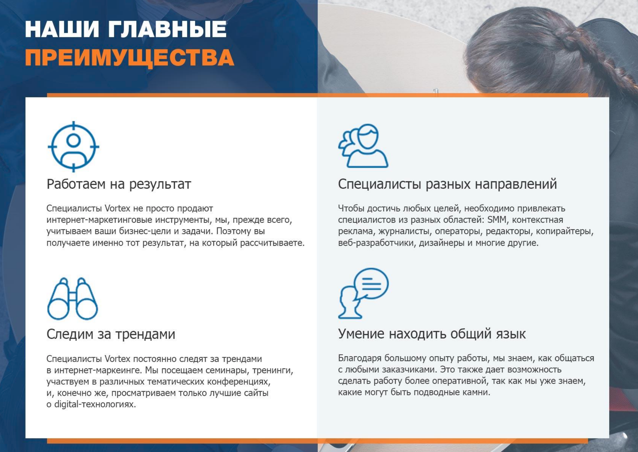 Сегодня компания Vortex – это более 20 профессионалов в сфере интернет-маркетинга: программисты, дизайнеры, верстальщики, контент-менеджеры, редакторы, фотографы, журналисты, маркетологи, менеджеры по работе с клиентами, специалисты по SMM и SEO.