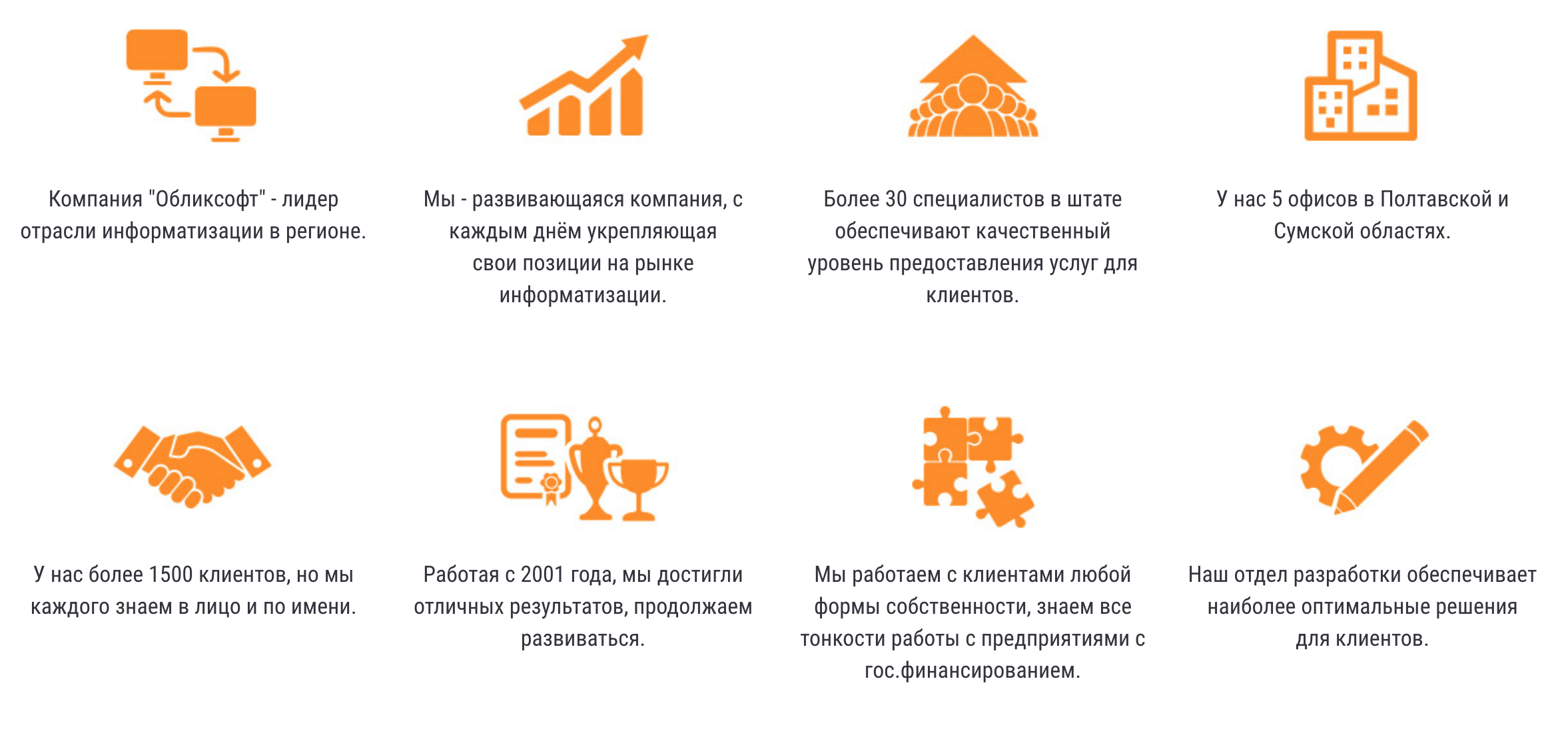 ООО «Обликсофт» - лидер отрасли информатизации (по данным международного экономического рейтинга «Ліга кращих» 2010 г., 2014г.). Компания которая за 14 лет успешной деятельности заняла и стабильно удерживает лидирующие позиции на рынке ИТ-технологий в Полтавском и Сумском регионах. Мы являемся официальным партнером компаний: «ESET» (антивирус NOD32), «Интеллект-Сервис», «АЦСК Украина», Microsoft, Битрикс.
