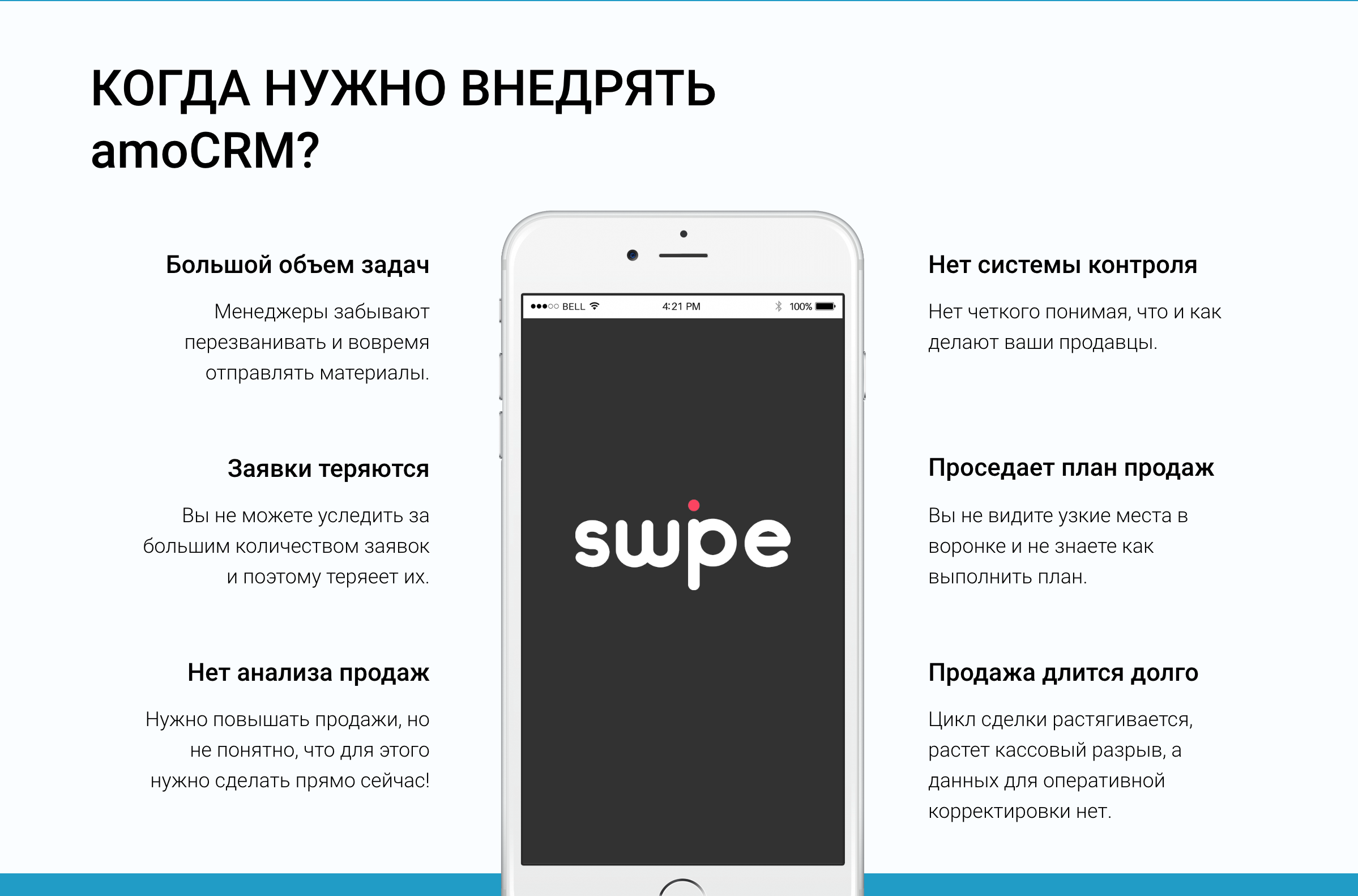 Swipe - компания по интеграции amoCRM, IP- телефонии, сквозной аналитики и профильных сервисов для автоматизации продаж. Индивидуальный подход, сопровождение на всех этапах, обучение менеджеров и руководителей, проработка сложных ТЗ. Мы работаем по всей Украине, и используем только те сервисы и решения, которые лучше всего подходят для украинского рынка.